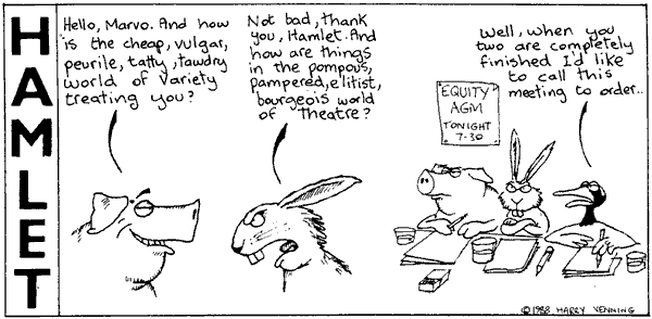 Hamlet Posted on August 5, 2008 by Simon Ogden Hamlet by Harry Venning – 1989, week 15 Share this: Click to share on Facebook (Opens in new window) Facebook Click to share on X (Opens in new window) X Like Loading... Published by Simon Ogden View all posts by Simon Ogden